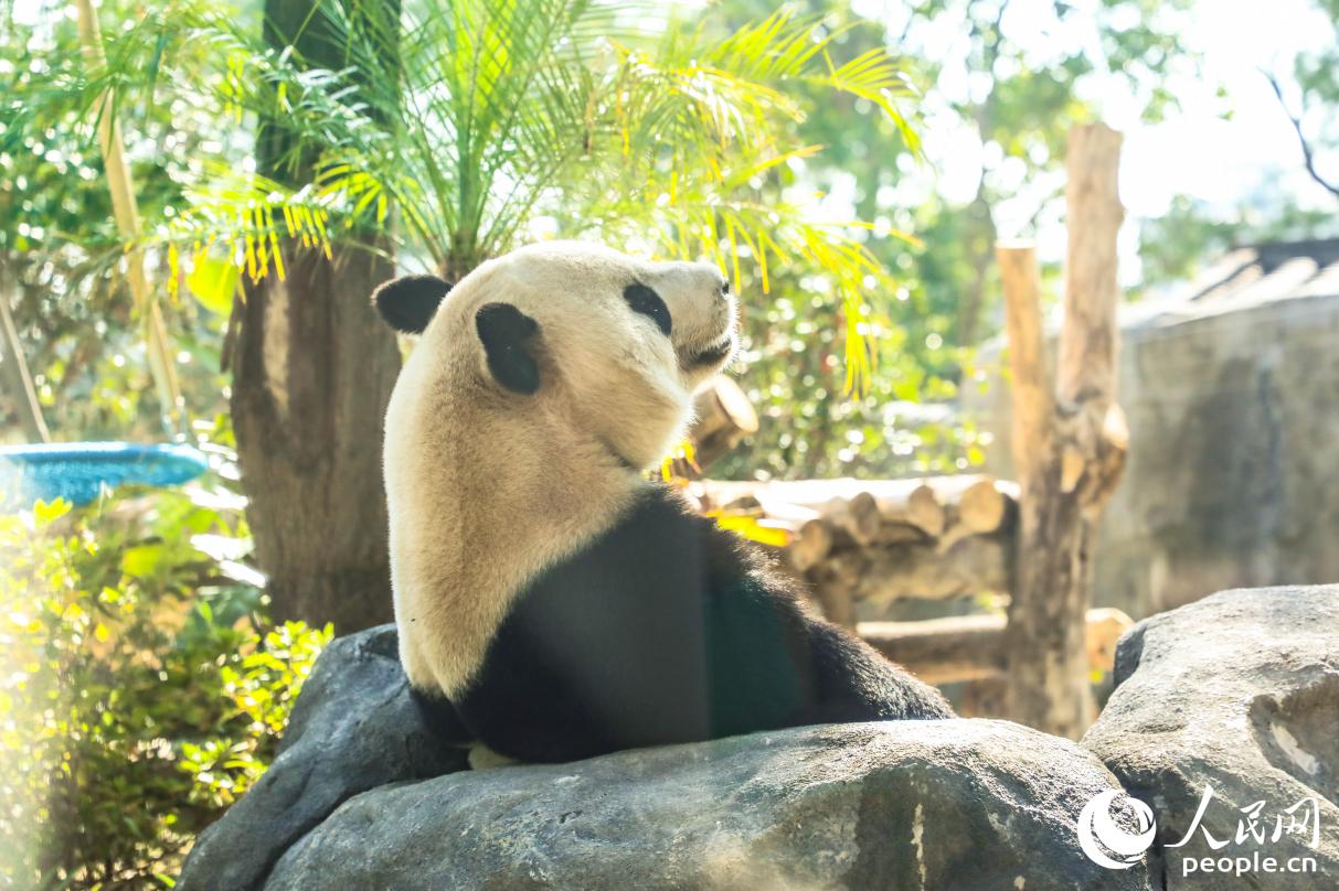餐后“晒太阳”的熊猫。人民网记者 李唯一摄