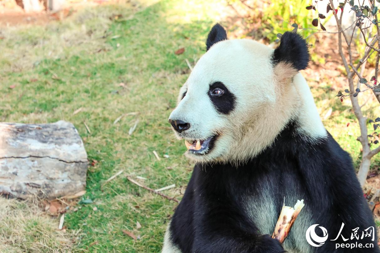 福州熊猫世界内,一只熊猫正在“吃早餐”。人民网记者 李唯一摄