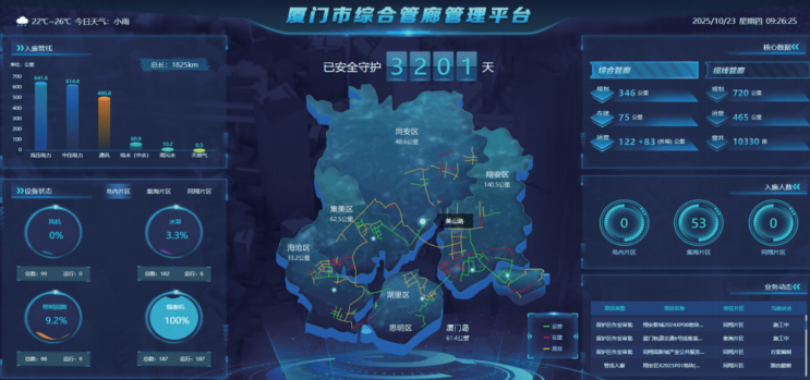 为贯彻落实党的二十大和中央经济工作会议精神及《中共中央国务院关于推动城市高质量发展的意见》《中共中央办公厅国务院办公厅关于持续推进城市更新行动的意见》《住房城乡建设部关于推进城市基础设施生命线安全工程的指导意见》等政策部署要求,厦门市扎实有序推进综合管廊相关建设,目前已建成投用干支线综合管廊约120公里,缆线管廊约465公里,已入廊各类市政管线总长超1800公里,相关经验成效推广至北京、济南、龙岩等全国20余个城市,为助力智慧韧性城市建设,贡献“厦门经验”。厦门市政管廊投资管理有限公司(以下简称“厦门管廊公司”)作为厦门市综合管廊建设运营企业,积极响应国家《关于构建数据基础制度更好发挥数据要素作用的意见》《“数据要素×”三年行动计划(2024—2026年)》《可信数据空间发展行动计划(2024—2028年)》等工作部署,在原有信息建设基础上,聚焦综合管廊安全高效和可持续发展,积极探索数据要素应用,挖掘数据价值,解决企业提质降本增效及安全应急等需要,打破系统“信息孤岛”、协同机制不畅等痛点难点问题,系统构建以多源数据融合为基础的管廊数据要素价值化体系,探索以数据要素为核心驱动力的城市治理现代化新路径。