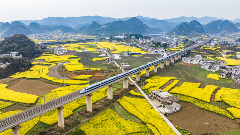 安六高速铁路上的动车组列车驶过贵州省安顺市普定县化处镇(2025年3月22日摄,无人机照片)。新华社记者 陶亮 摄