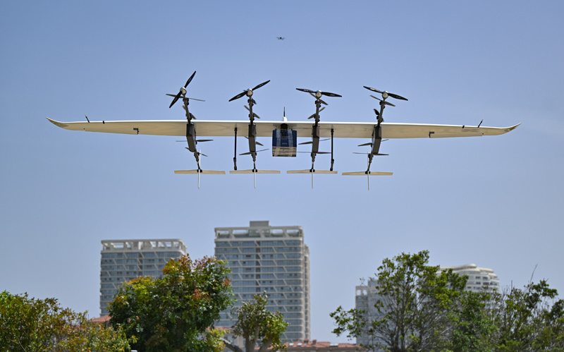 一架物流无人机装载货物从位于海南海口的消博会展馆外起飞,跨越琼州海峡飞往广东徐闻港(2025年4月14日摄)。新华社记者 郭程 摄