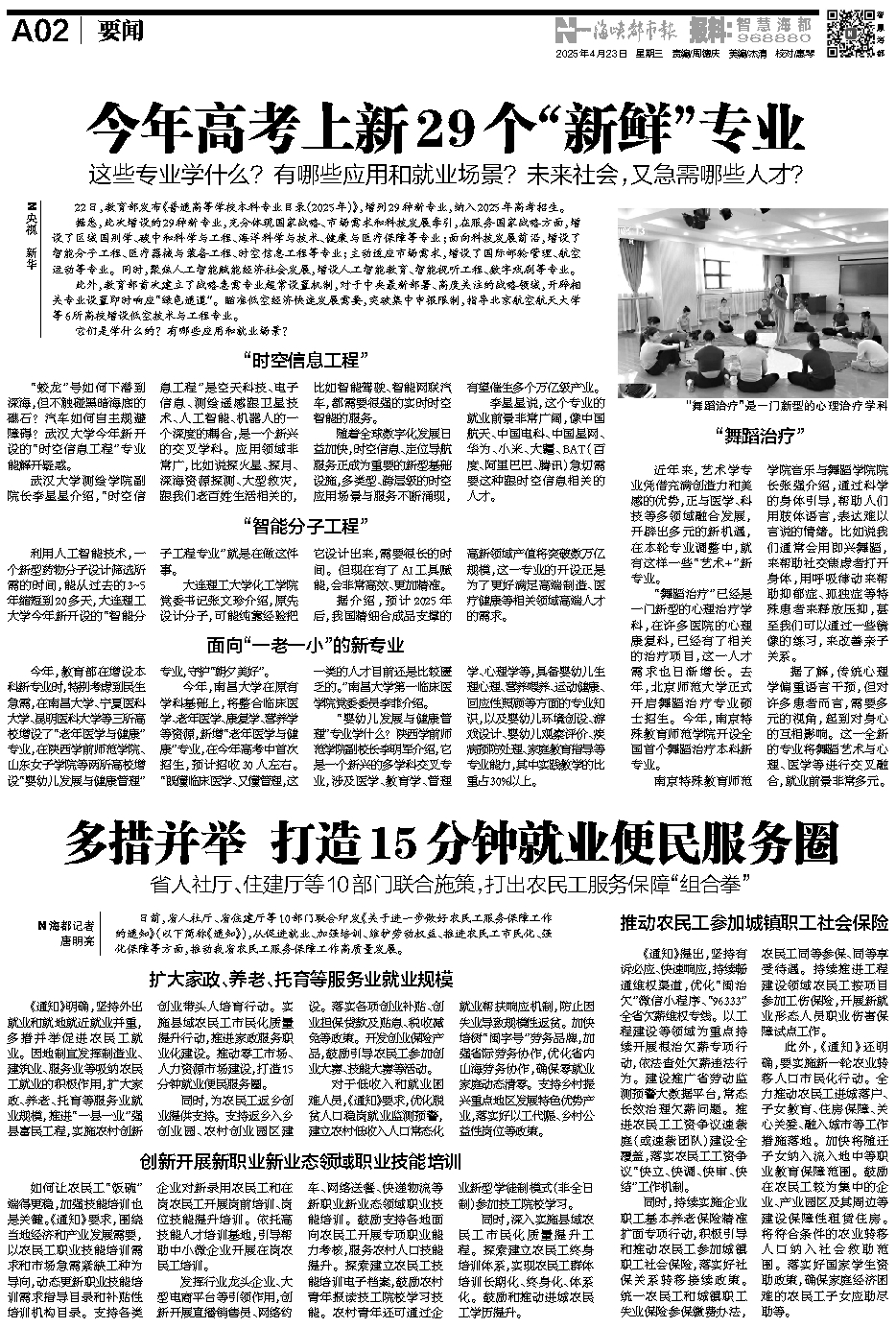 《通知》明确,坚持外出就业和就地就近就业并重,多措并举促进农民工就业。因地制宜发挥制造业、建筑业、服务业等吸纳农民工就业的积极作用,扩大家政、养老、托育等服务业就业规模,推进“一县一业”强县富民工程,实施农村创新创业带头人培育行动。实施县域农民工市民化质量提升行动,推进家政服务职业化建设。推动零工市场、人力资源市场建设,打造15分钟就业便民服务圈。