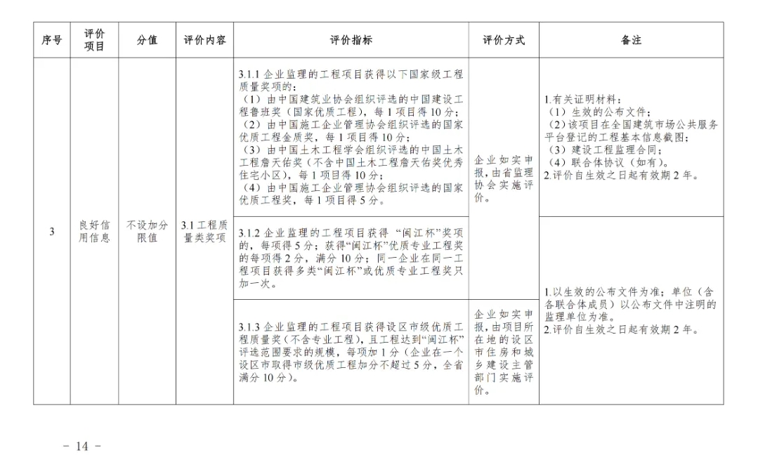 企业通常行为、建设单位对监理评价的评价标准详见附件,企业项目实施行为评价标准按《福建省房屋市政工程质量安全动态监管办法》实施。