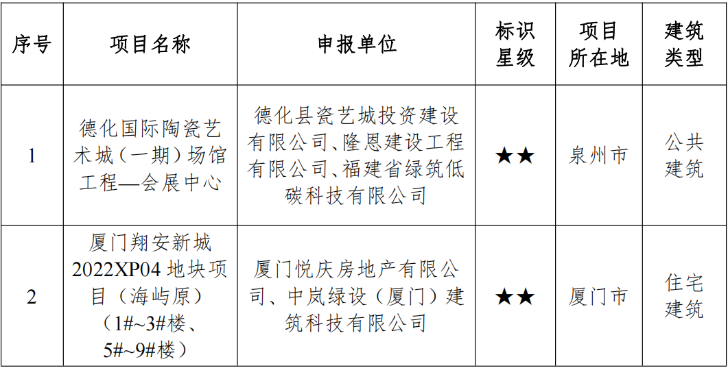按照《绿色建筑标识管理办法》(建标规〔2021〕1号)和《福建省绿色建筑标识管理实施细则》(闽建〔2022〕7号)有关规定,省住建厅组织开展了2025年度第三批二星级绿色建筑标识项目认定工作。经项目单位申报、项目所在设区市住房和城乡建设主管部门推荐、省住建厅组织专家评审并向社会公示,确定德化国际陶瓷艺术城(一期)场馆工程—会展中心、厦门翔安新城2022XP04地块项目(海屿原)(1#~3#楼、5#~9#楼)2个项目获得二星级绿色建筑标识,现予公布。