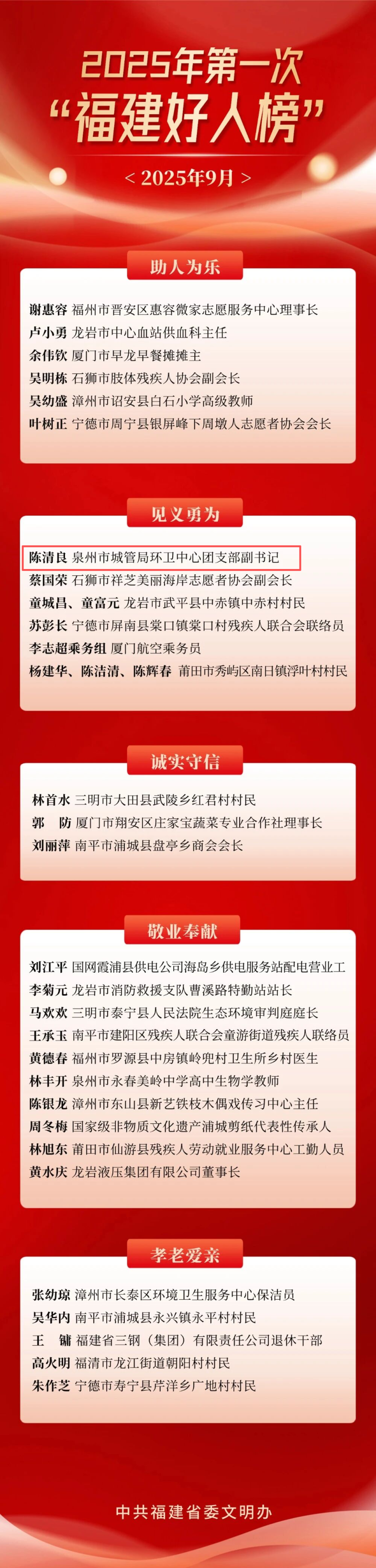 陈清良,男,1988年6月生,中共党员,福建省泉州市城管局环卫中心团支部副书记。2025年5月27日17时许,泉州丰泽区一辆土方车倒车时,因视线盲区,撞倒后面的电动车并将一对母子卷入车底。陈清良刚好下班路过,听到呼救声后,眼看倒在地上的母子就将要被土方车碾轧,他毫不犹豫地跳下自行车,冲了过去,钻进还在继续倒车的土方车底,6秒内两次穿梭车底,救下6岁儿童和被电动车压住的女士。