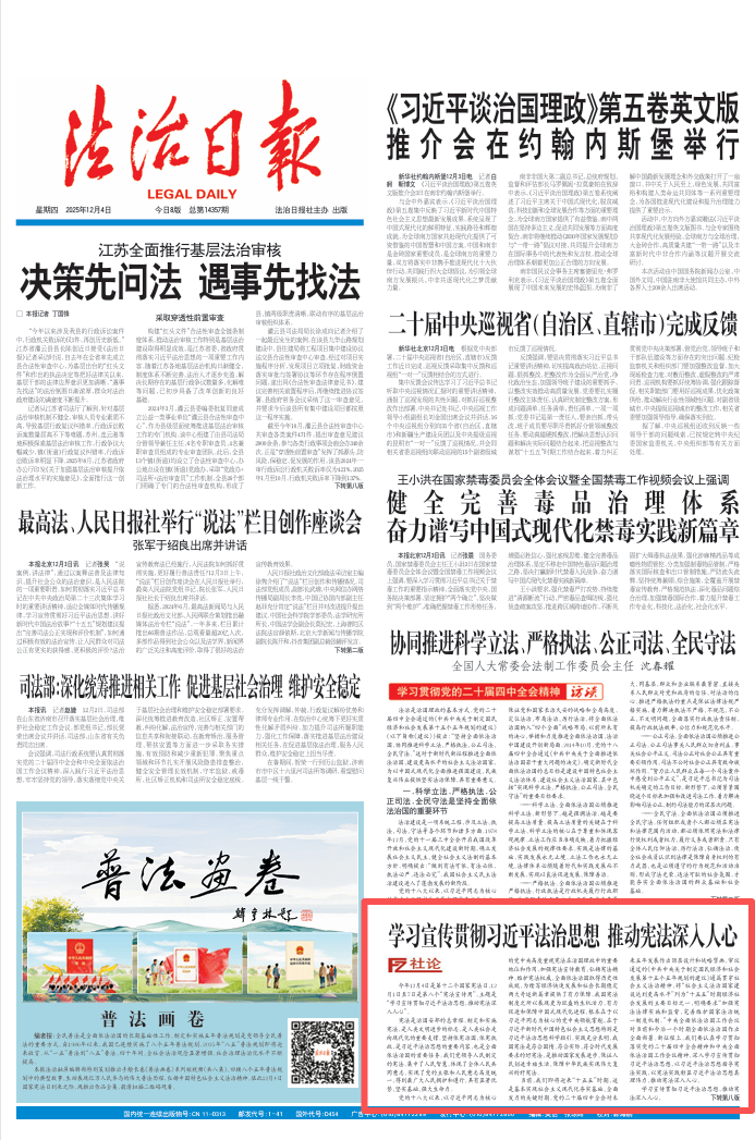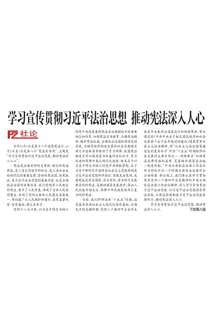 今年12月4日是第十二个国家宪法日,12月1日至7日是第八个“宪法宣传周”,主题是“学习宣传贯彻习近平法治思想,推动宪法深入人心”。