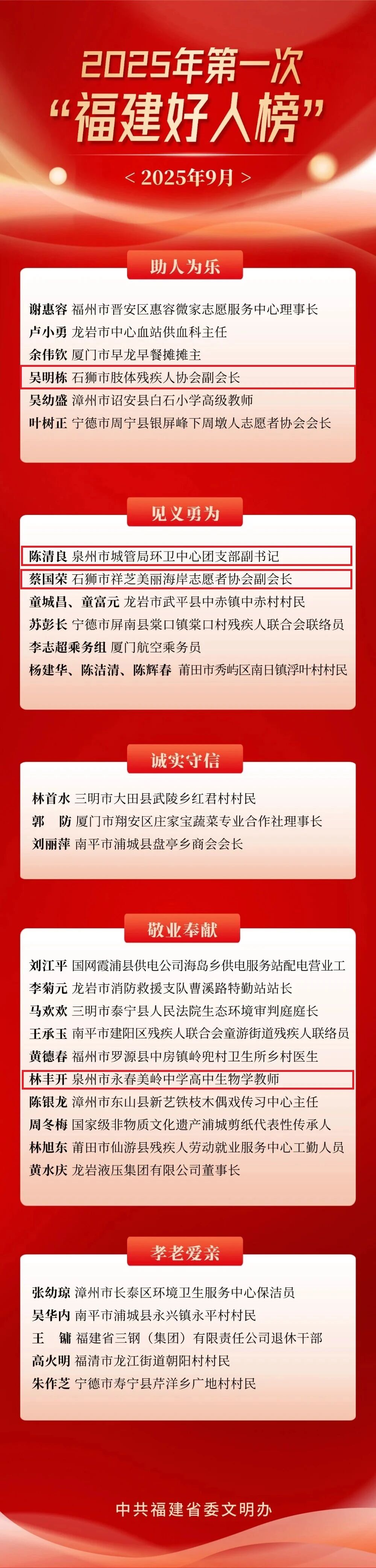 1. 陈清良,男,1988年6月生,中共党员,福建省泉州市城管局环卫中心团支部副书记。2025年5月27日17时许,泉州丰泽区一辆土方车倒车时,因视线盲区,撞倒后面的电动车并将一对母子卷入车底。陈清良刚好下班路过,听到呼救声后,眼看倒在地上的母子就将要被土方车碾轧,他毫不犹豫地跳下自行车,冲了过去,钻进还在继续倒车的土方车底,6秒内两次穿梭车底,救下6岁儿童和被电动车压住的女士。