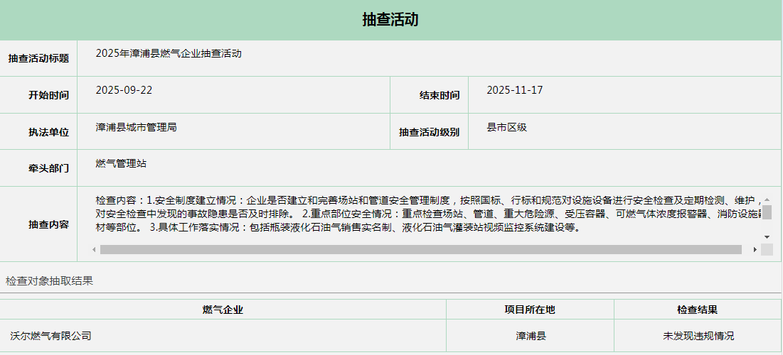 2025年漳浦县燃气企业抽查活动